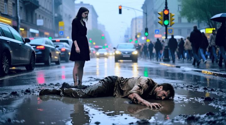 Люди шли мимо. Кто-то бросал взгляд и ускорял шаг. Кто-то отводил глаза, будто боялся, что боль заразна. Один мужчина даже перешёл на другую сторону улицы, хотя зонт у него был большой. Женщина с ребёнком на руках обогнула лежащего так, будто он — лужа, которую можно обойти.