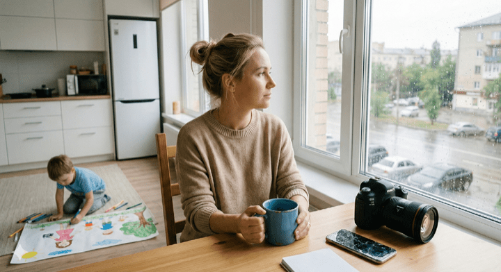 Через три месяца после развода я сидела на кухне. Тёмка рисовал за новым столом. Я подошла и заглянула через плечо. На листе был нарисован парк. Деревья, качели. И две фигурки. Одна — маленькая, с машинкой в руках. Вторая — побольше, с чёрным прямоугольником на шее. — Это кто, Тём? — спросила я, поправляя ему чёлку. — Это ты, мам. С камерой. Смотри, ты меня снимаешь.